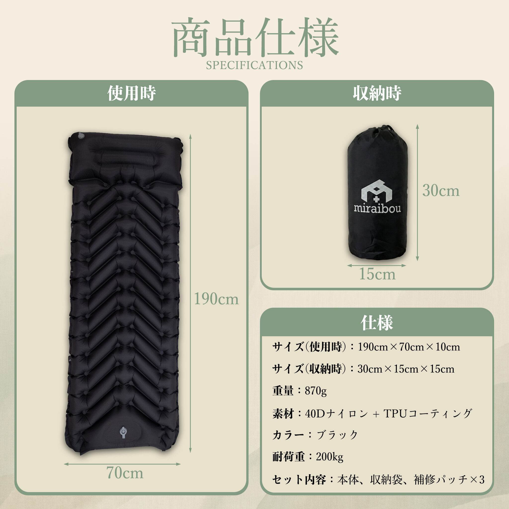 【多彩なシーンで活躍】 キャンプ・アウトドア:テント泊やタープ泊での快適な睡眠をサポート。コットの上に敷けば、さらにクッション性が向上します。 車中泊:シートの段差を解消し、フラットで快適な寝床を確保。長距離ドライブの休憩や、車中泊旅行に最適です。 防災・緊急時:避難所などでの簡易ベッドとして。コンパクトに収納できるので、防災リュックに常備しておくと安心です。 来客用:急な来客時の予備寝具として。使わない時はコンパクトに収納できるので、収納スペースを取りません。 オフィスでの仮眠:休憩時間の仮眠用マットとして。疲労回復に効果的です。