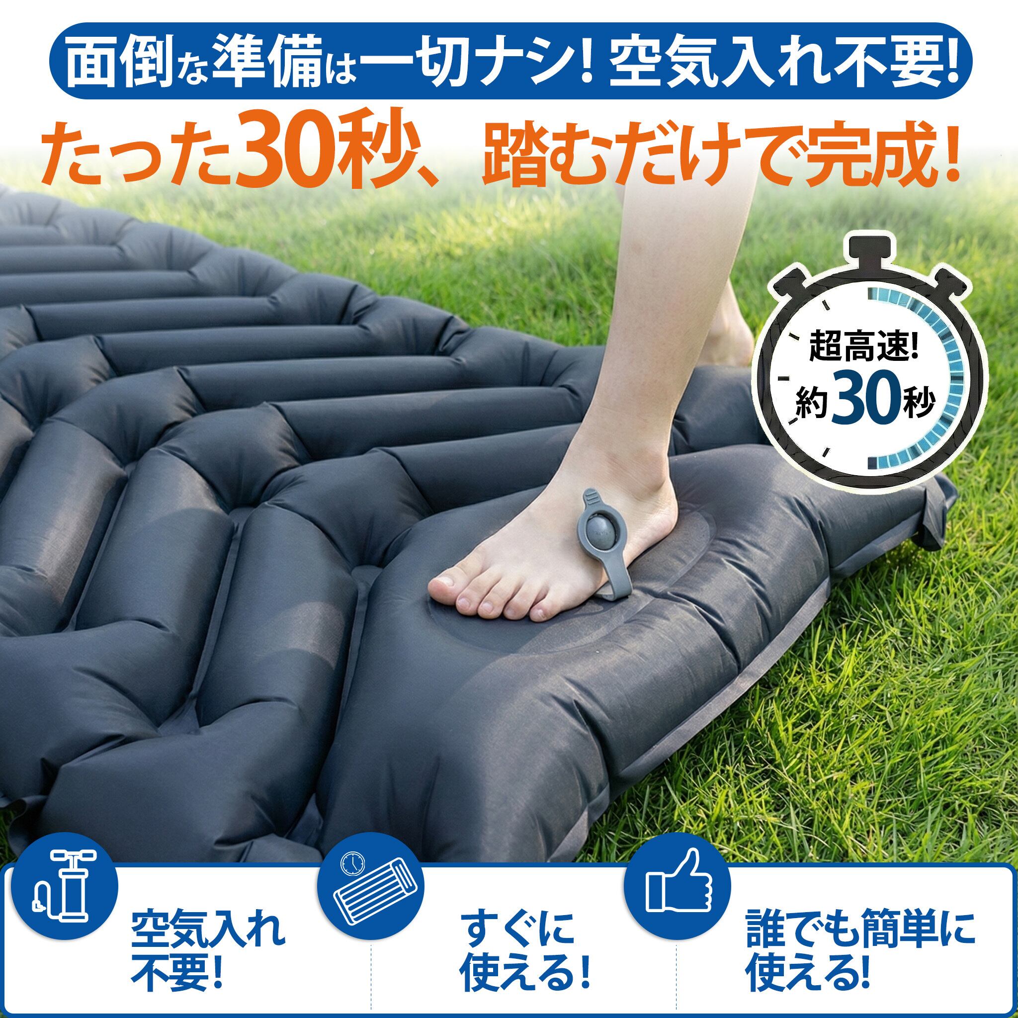 【すぐに使えて後片付けも簡単】 マットに内蔵されたポンプを足で踏むだけで、約30秒~1分で設営完了。 電動ポンプや手動ポンプを別途用意する必要がなく、ベッド本体を減らせます。 力も時間もかからないので、女性や子供でも簡単に膨らませることができます。 使用後に片付ける際も排気バルブを開けるだけで、空気がすぐに抜けます。 収納袋も付いているので、省スペースで保管できます。