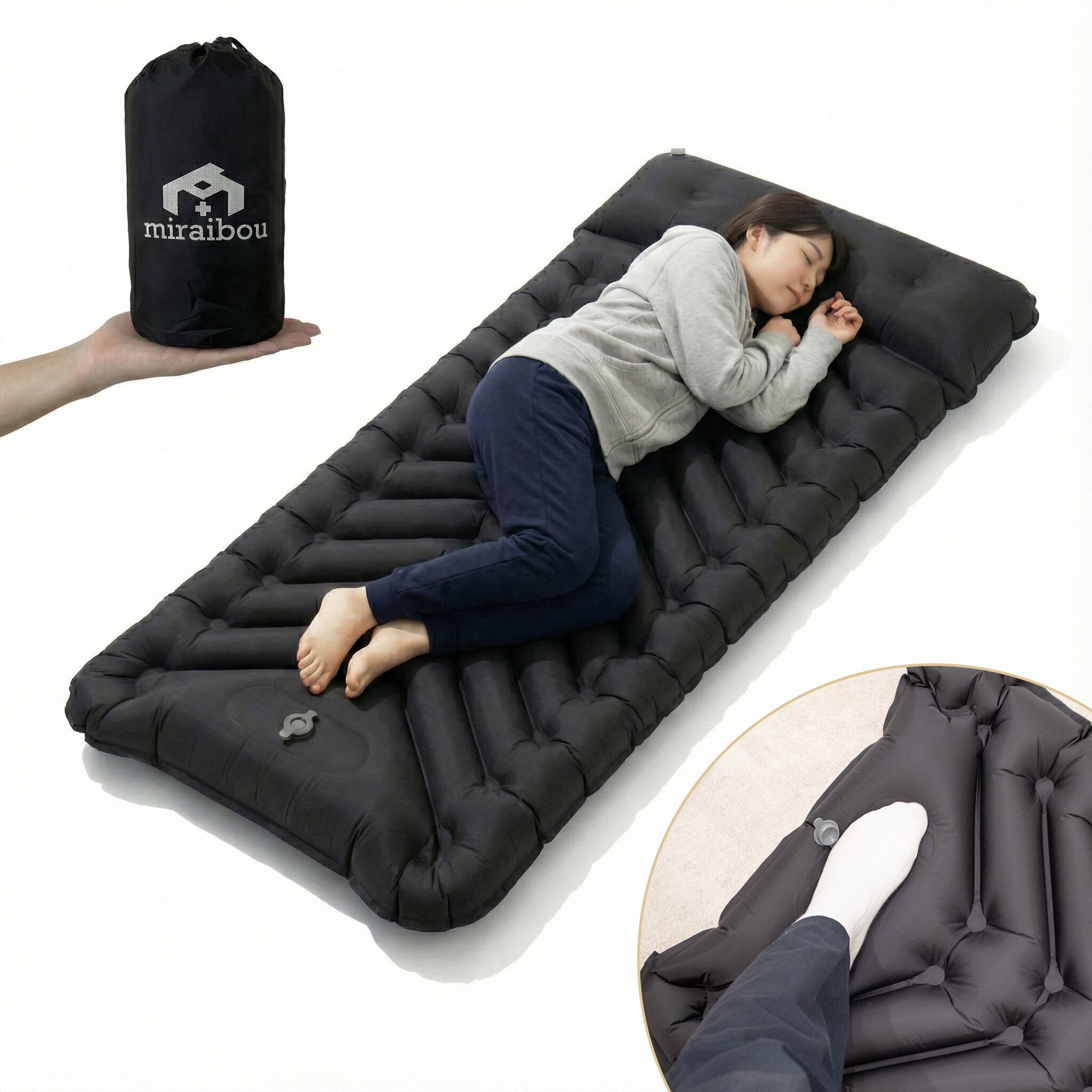 エアーマット シングル 190×70×10cm 足踏み式 枕付き 収納袋付き 軽量 コンパクトエアーベッド エアベッド キャンプマット miraibou ミライボウ アウトドア 災害マット | AQool公式BASE店